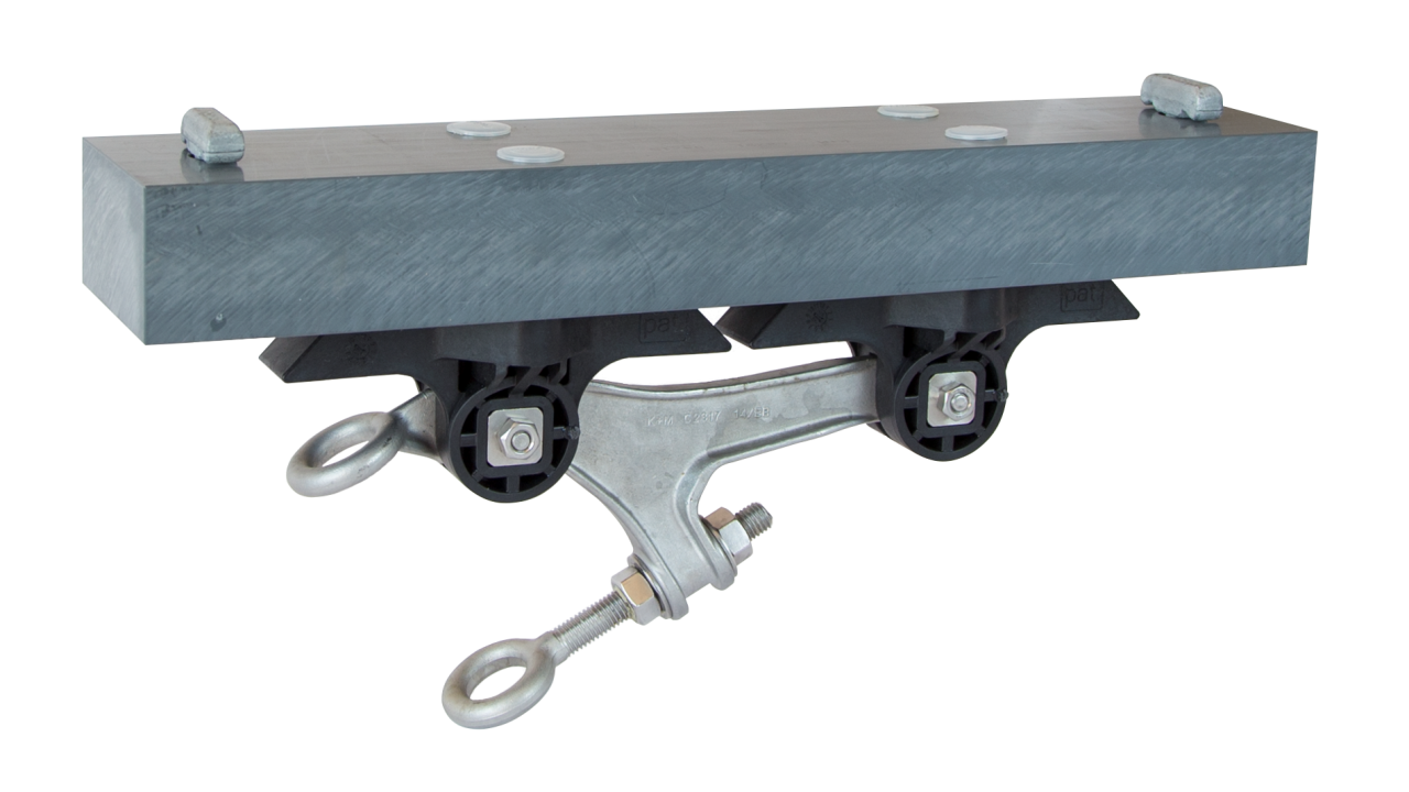 Isolierkörper zur Befestigung an Ankerschienen Typ 3B, in mittleren bis engen Kurven. Stufenlose Einstellung der Doppel-Öse, zur Aufnahme von alle Typen von Kurvenschienen.Spezifikationen