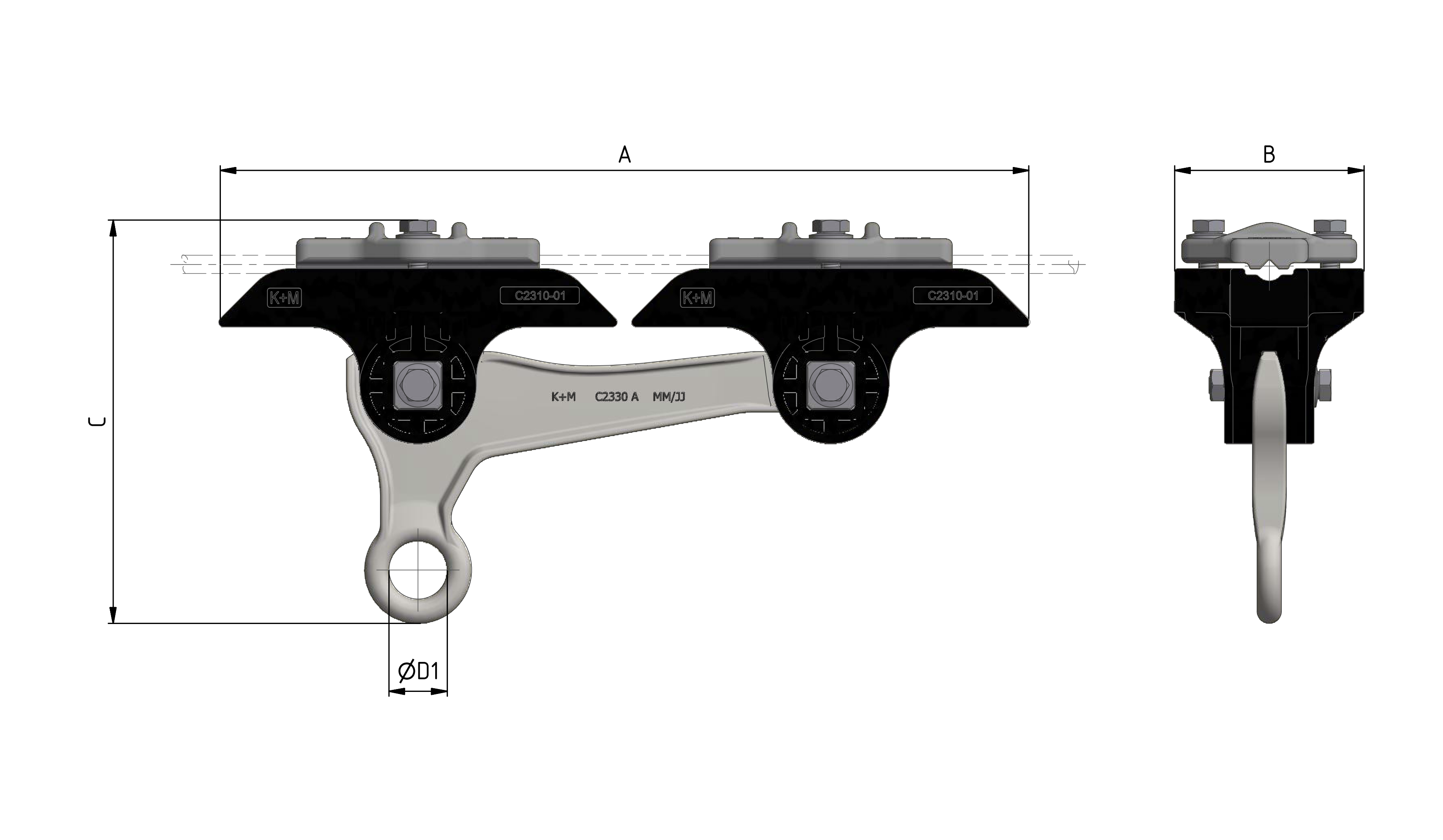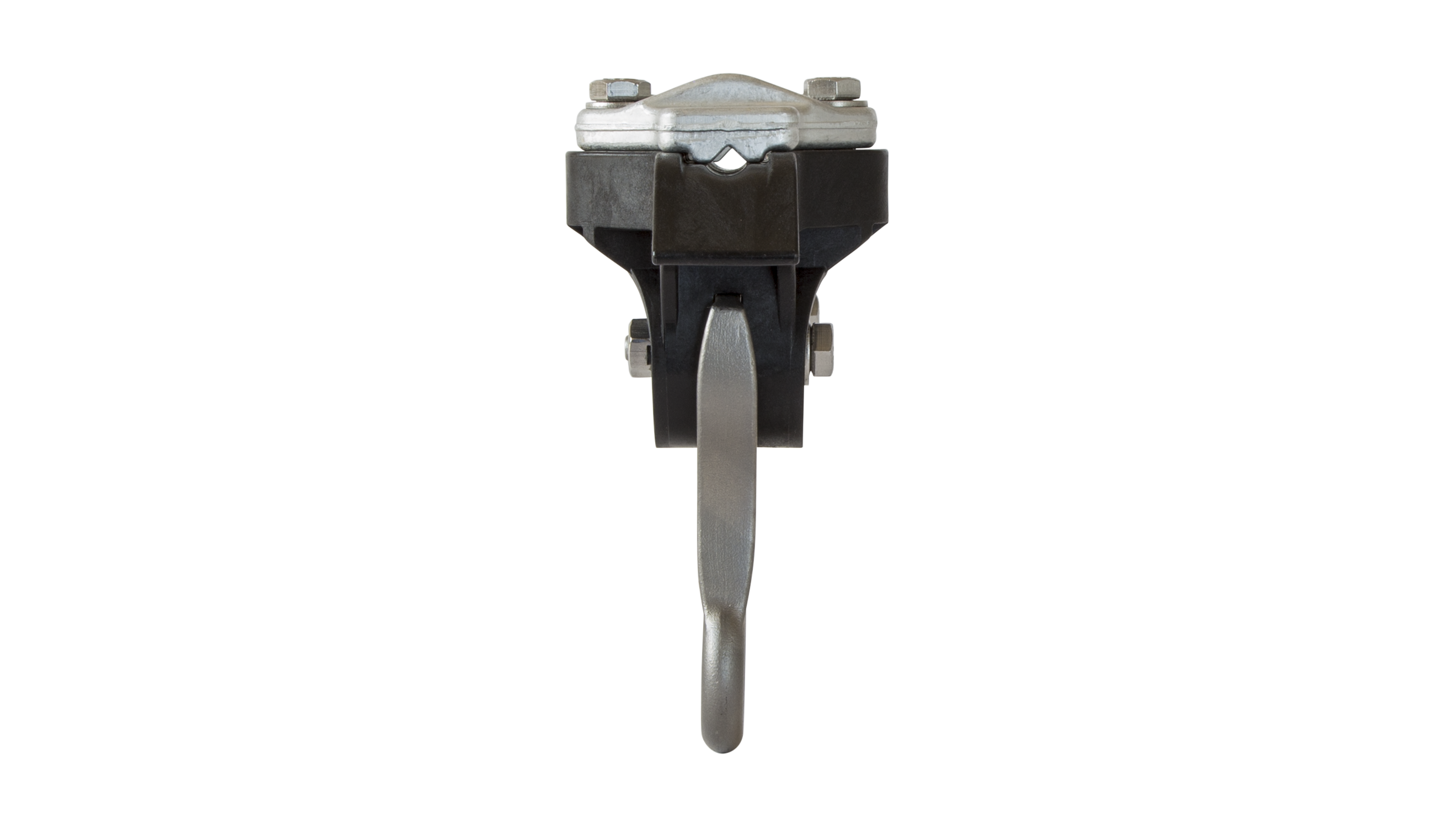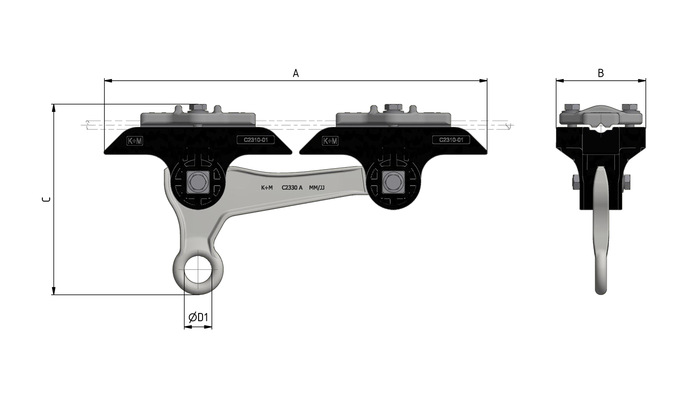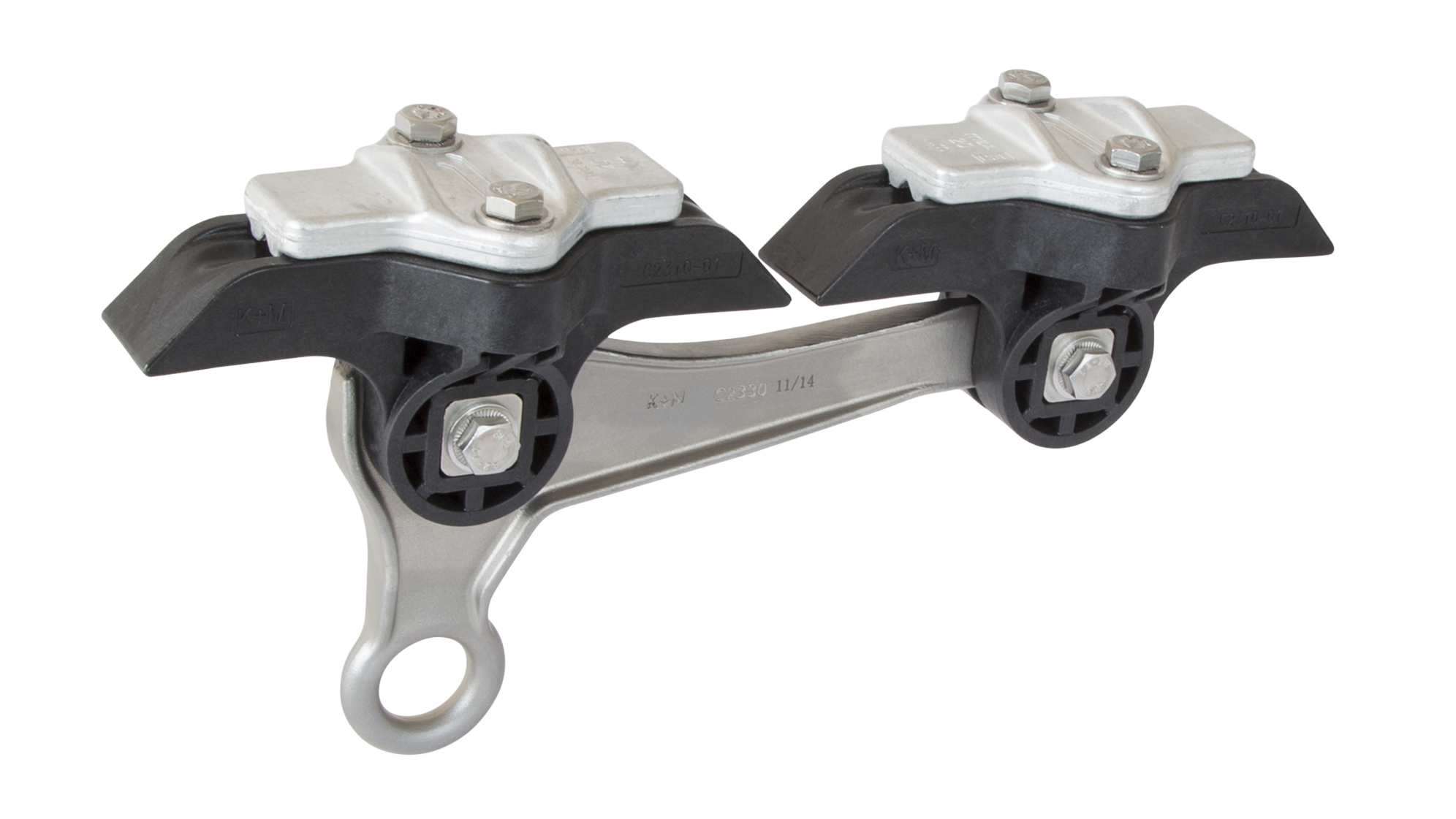 Isolierkörper zur Befestigung an Querspannseil, in mittleren bis engen Kurven. Zur Aufnahme von Strassenbahn-Hängedrähte und Spurhalter.