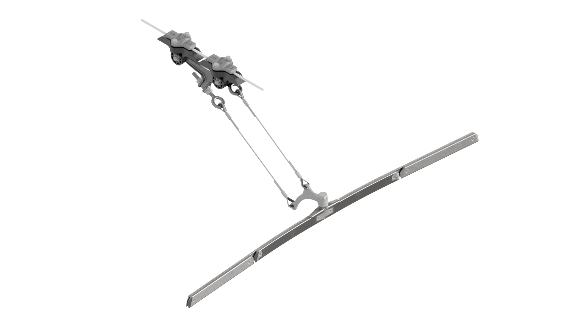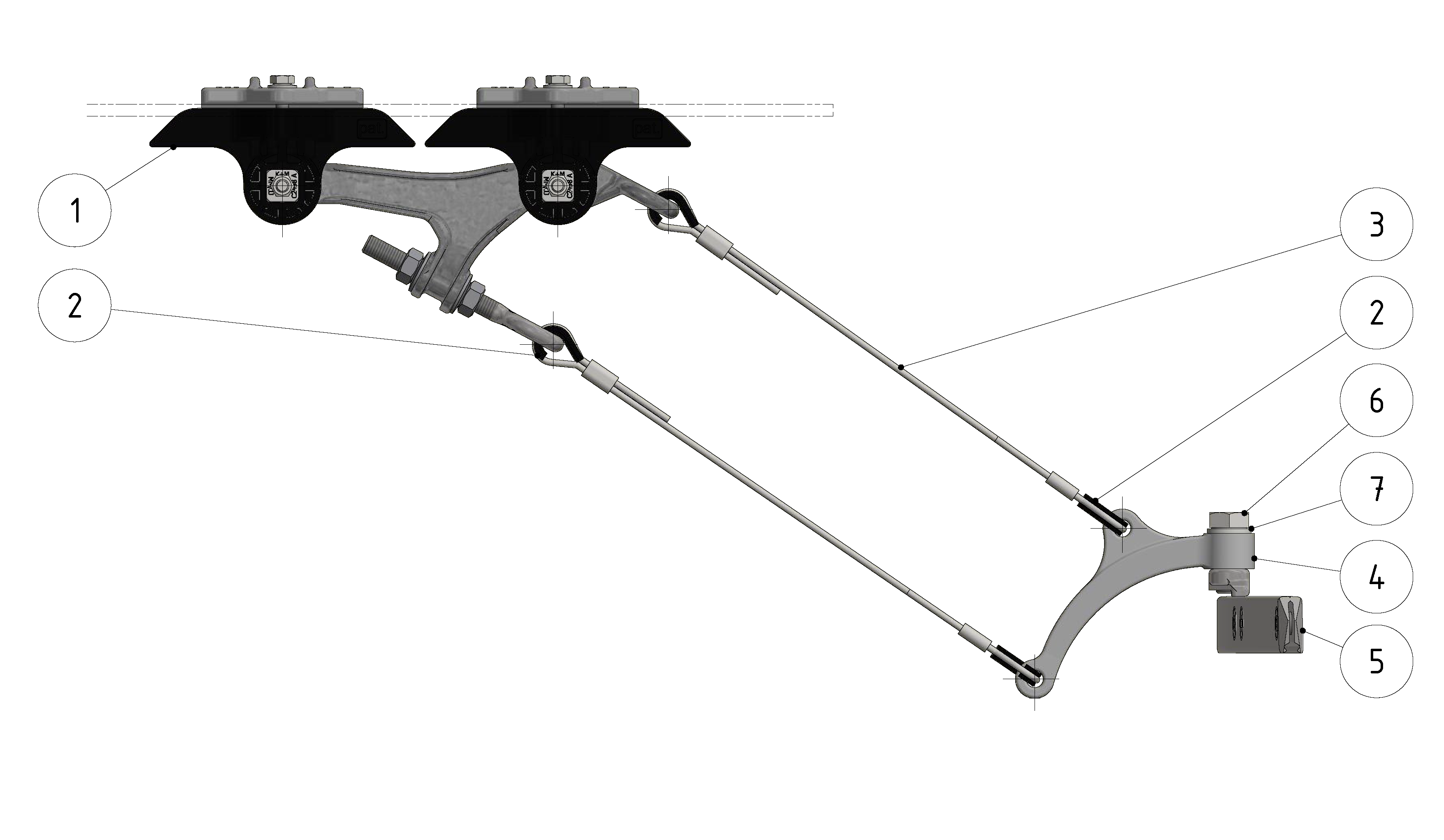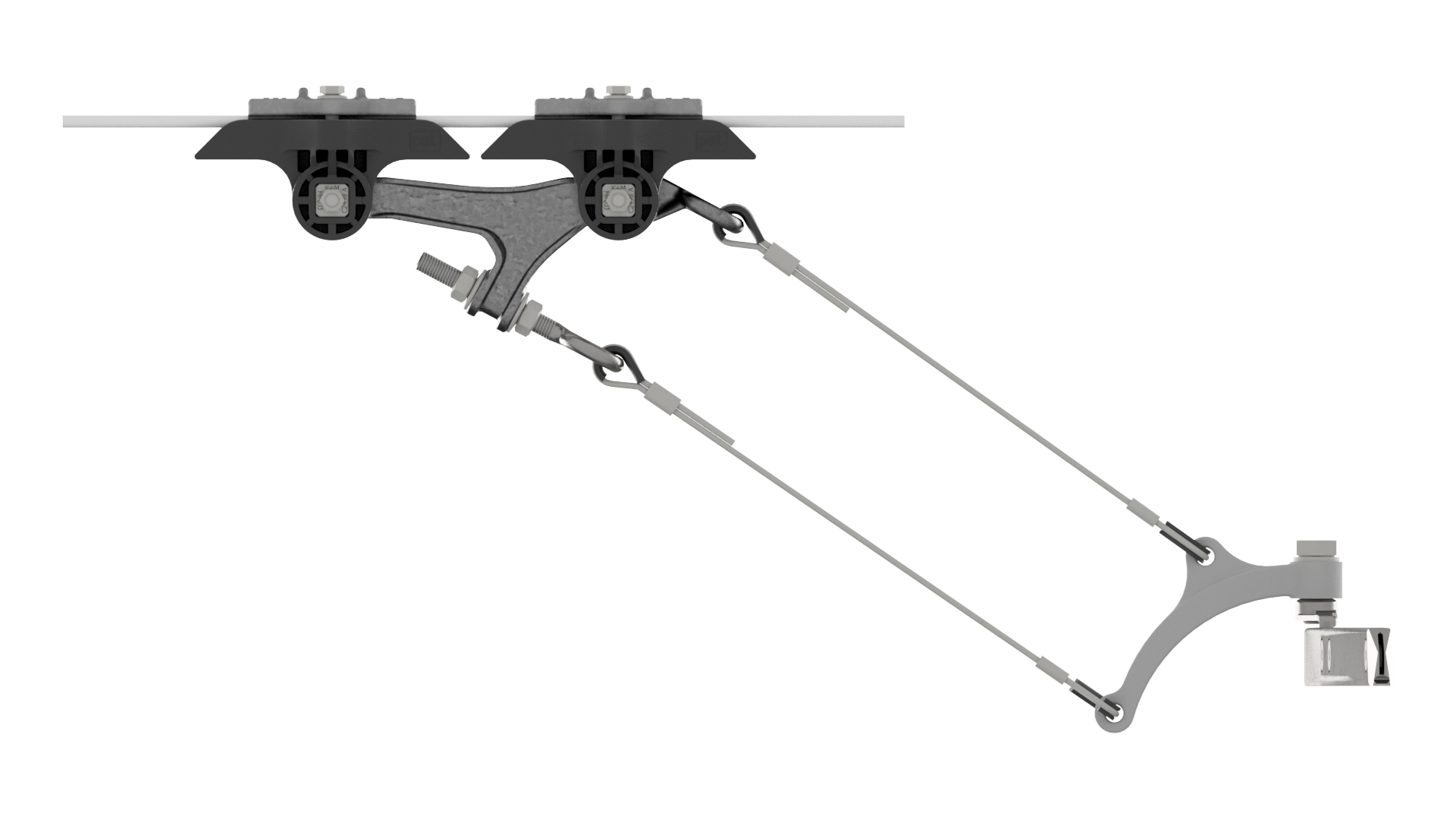 Contact wire suspension ETB with line insulator KUSYS, in curves to cross-span steel/steel-copper cable 5.5-7.5° with curve rail type 1, M16