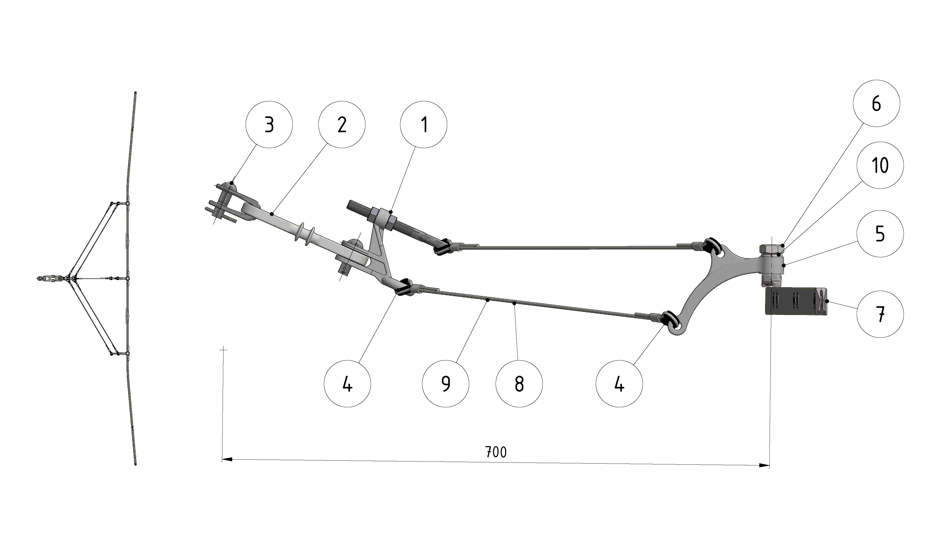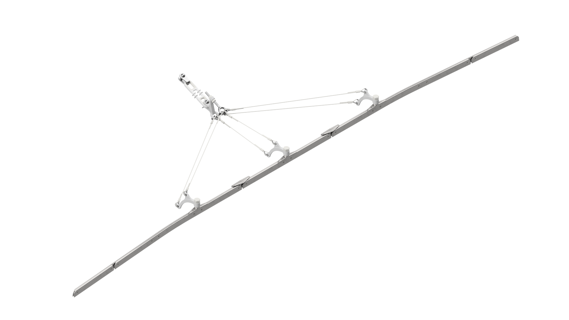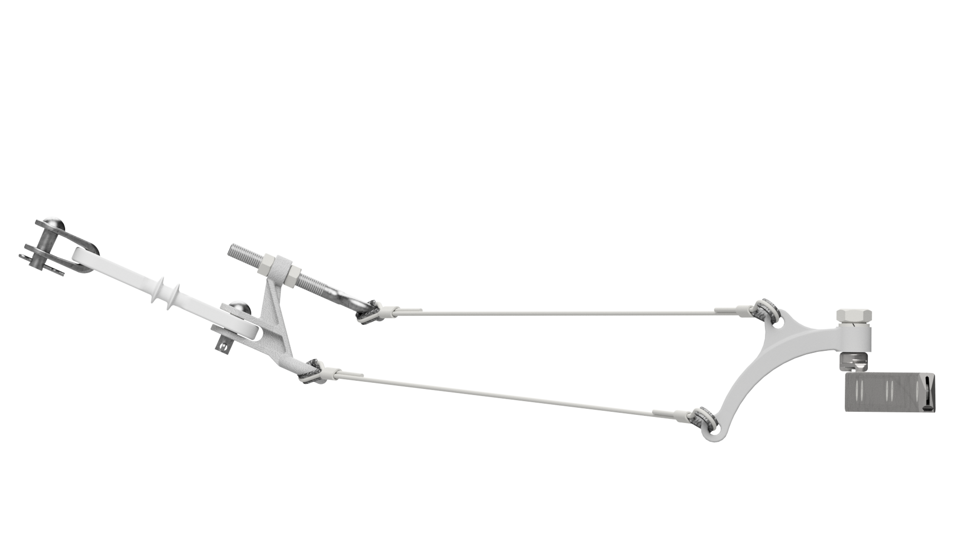 Suspension de ligne de contact TB avec boucle isolante, en courbes, sur retenue volante câble en acier/acier-cuivre 14.5-30° avec griffe de courbe type 4, M16