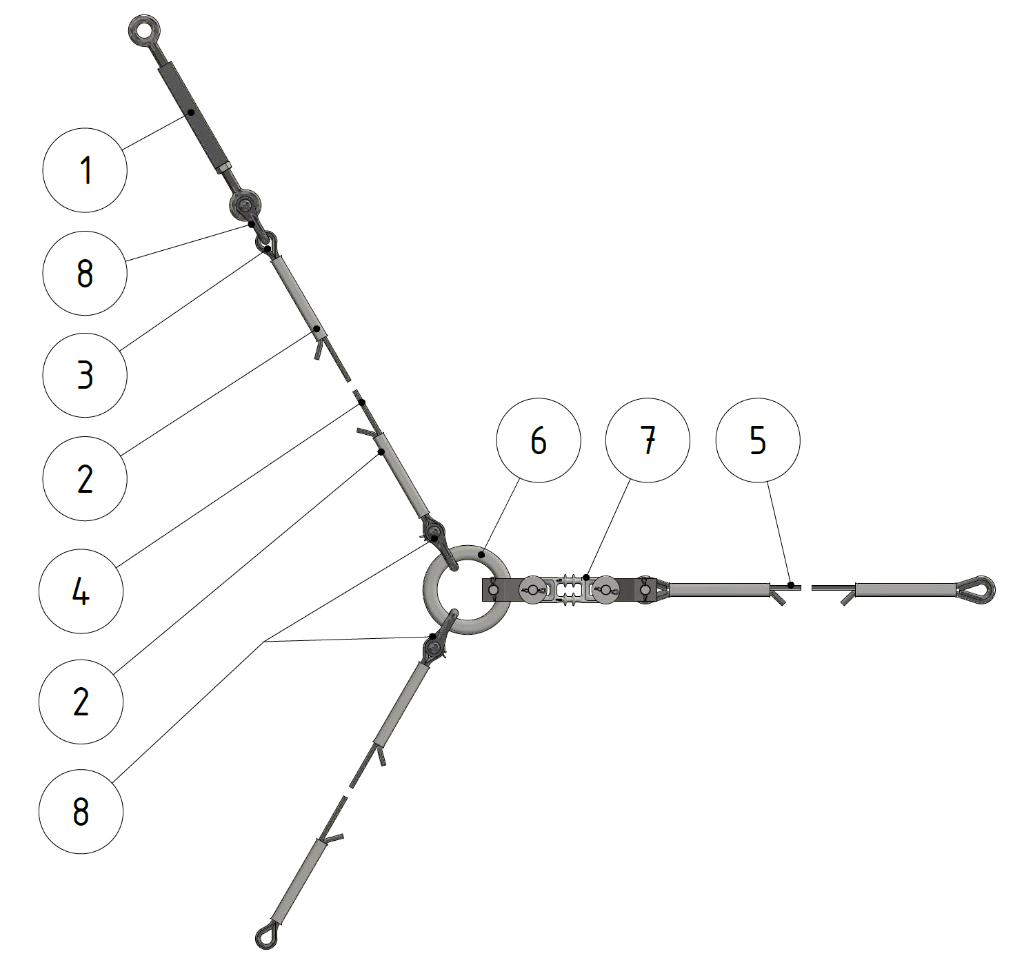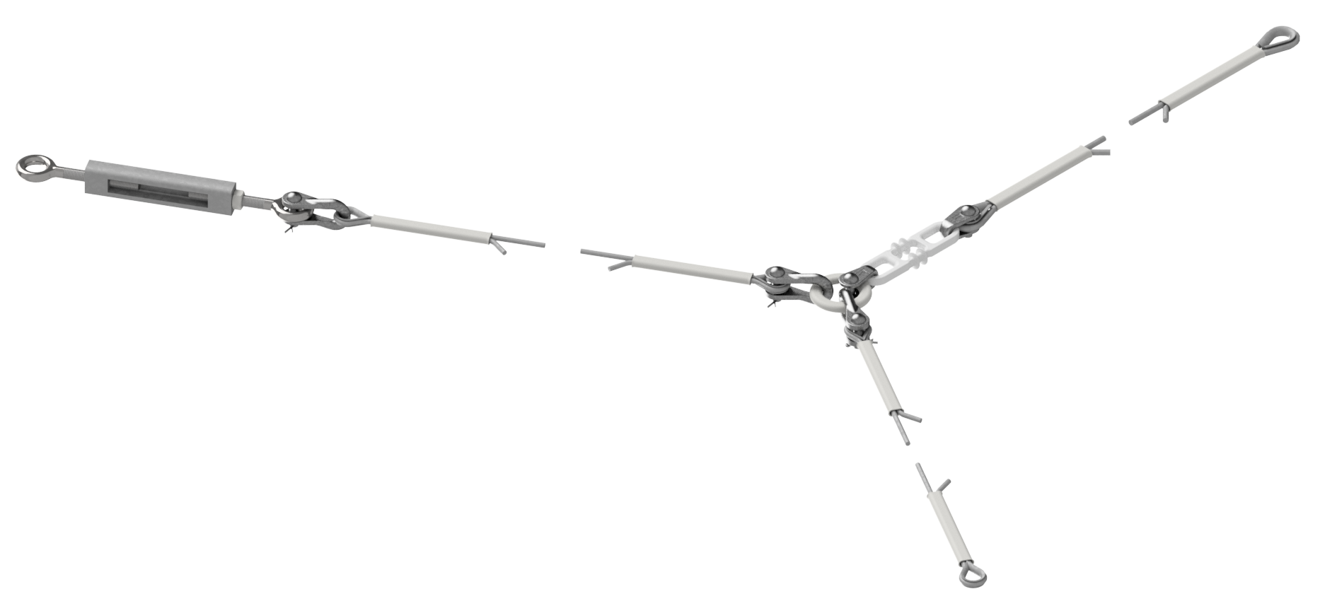 Retenue volante forme Y, câble en acier 50 mm² galv., avec 2 boucles isolantes, avec tendeur