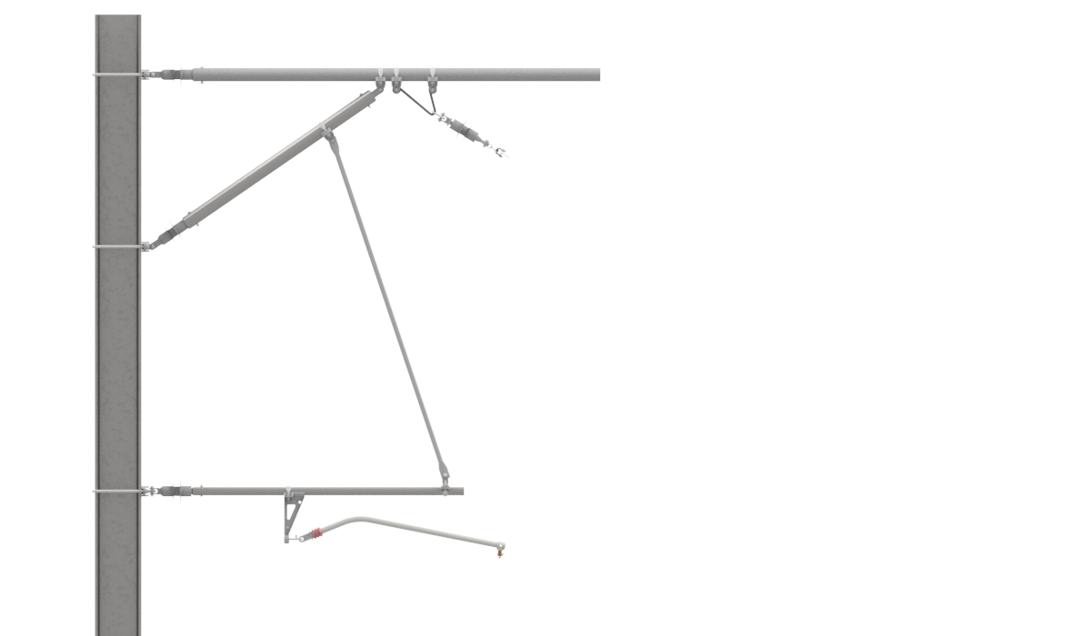 Das Auslegersystem berücksichtigt für alle Ausleger-, Streben- und Spurhalterrohre gleichbleibende Montagehöhen (b) am Masten. Die effektive Systemhöhe (sh) ist abhängig vom Neigungswinkel (β) des Tragseilisolatores. Mit den beschriebenen Befestigungshöhen am Masten wird eine Systemhöhe der FL-Kette von mindestens SH=2140mm bei Vertikalstellung des Tragseilisolators sichergestellt. Je nach Neigung des Tragseilisolatoren liegt die effektive Systemhöhe zwischen: