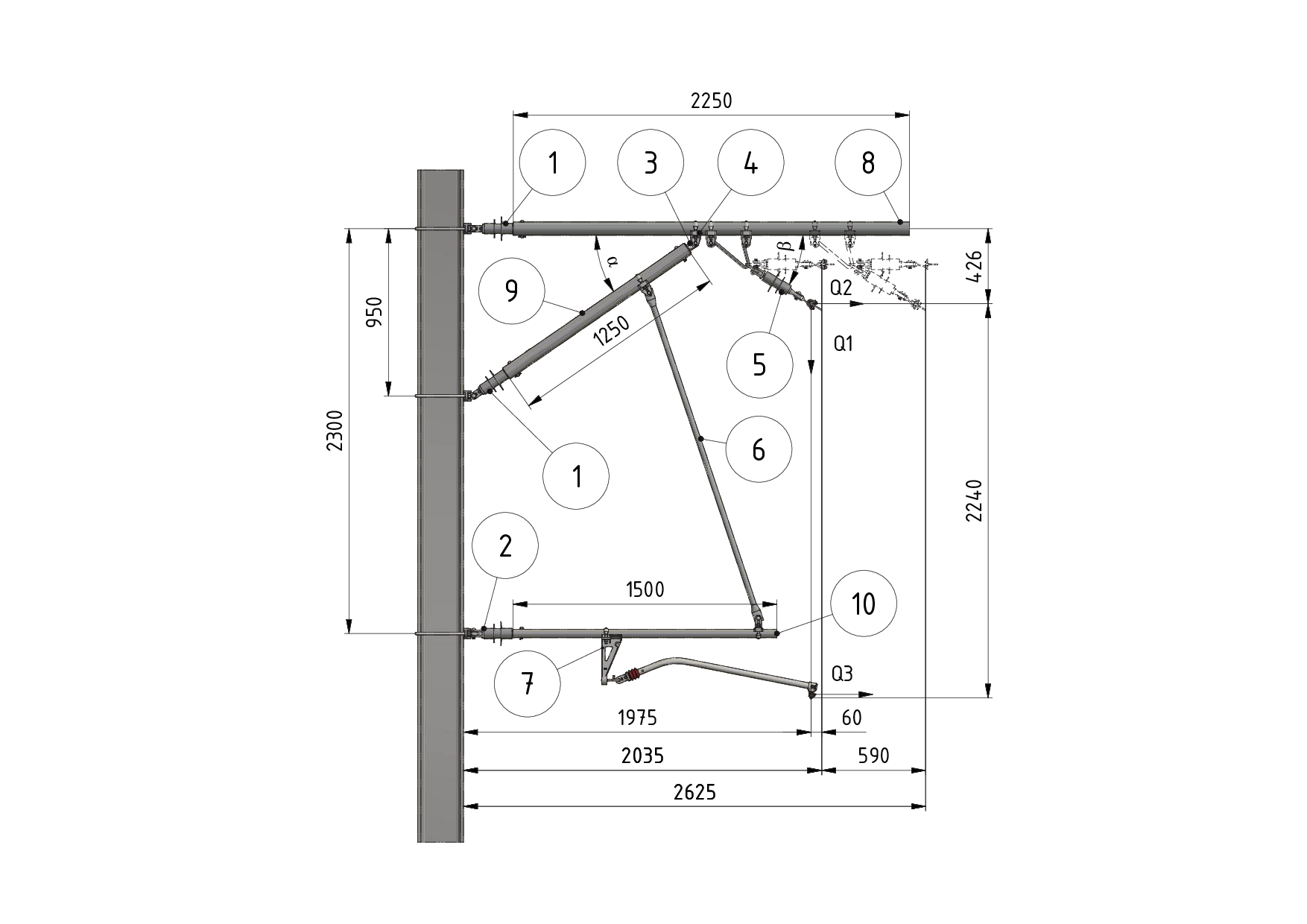 Ausleger mit Strebenrohr als Spurhaltertragrohraufhängung (Ausführungen -10 bis -18) Grundsätzlich wird für angelenkte Tragwerke aufgrund des Spurhalterzugkraft (Q3) eine Tragrohraufhängung mit Strebenrohr empfohlen.