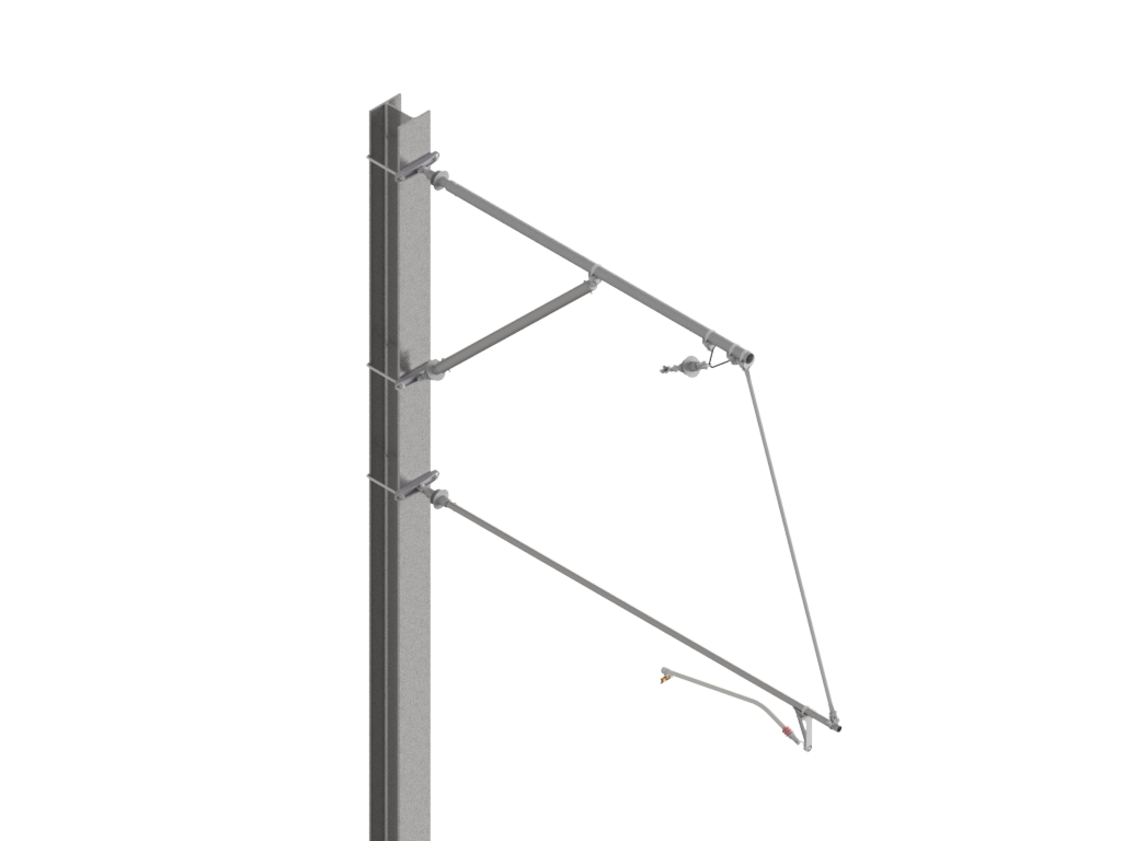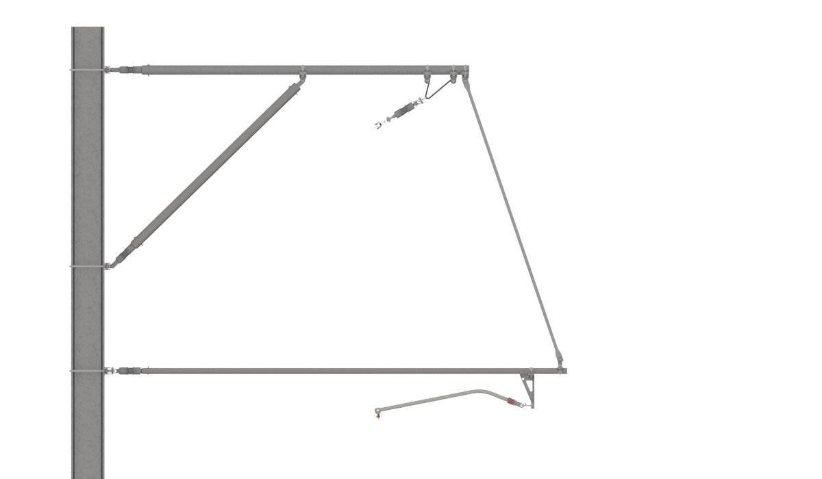 Das Auslegersystem berücksichtigt für alle Ausleger-, Streben- und Spurhalterrohre gleichbleibende Montagehöhen (b) am Masten. Die effektive Systemhöhe (sh) ist abhängig vom Neigungswinkel (β) des Tragseilisolatores. Mit den beschriebenen Befestigungshöhen am Masten wird eine Systemhöhe der FL-Kette von mindestens SH=2140mm bei Vertikalstellung des Tragseilisolators sichergestellt. Je nach Neigung des Tragseilisolatoren liegt die effektive Systemhöhe zwischen: