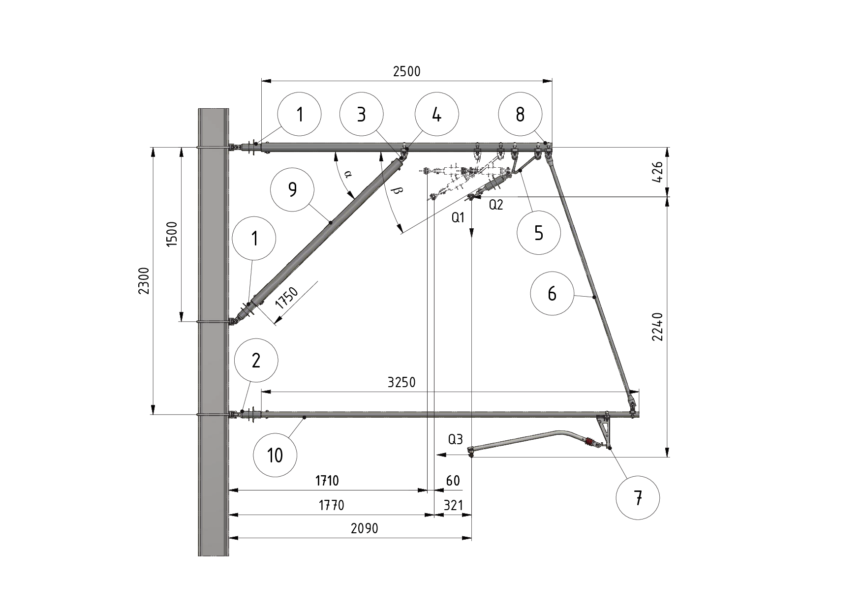 Ausleger mit Strebenrohr als Spurhaltertragrohraufhängung (Ausführungen -10 bis -18) Grundsätzlich wird für angelenkte Tragwerke aufgrund des Spurhalterzugkraft (Q3) eine Tragrohraufhängung mit Strebenrohr empfohlen.