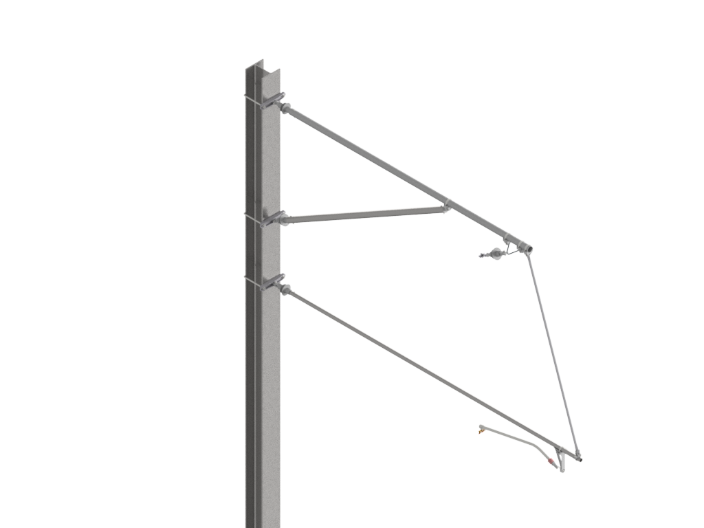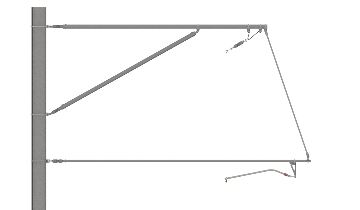 Das Auslegersystem berücksichtigt für alle Ausleger-, Streben- und Spurhalterrohre gleichbleibende Montagehöhen (b) am Masten. Die effektive Systemhöhe (sh) ist abhängig vom Neigungswinkel (β) des Tragseilisolatores. Mit den beschriebenen Befestigungshöhen am Masten wird eine Systemhöhe der FL-Kette von mindestens SH=2140mm bei Vertikalstellung des Tragseilisolators sichergestellt. Je nach Neigung des Tragseilisolatoren liegt die effektive Systemhöhe zwischen: