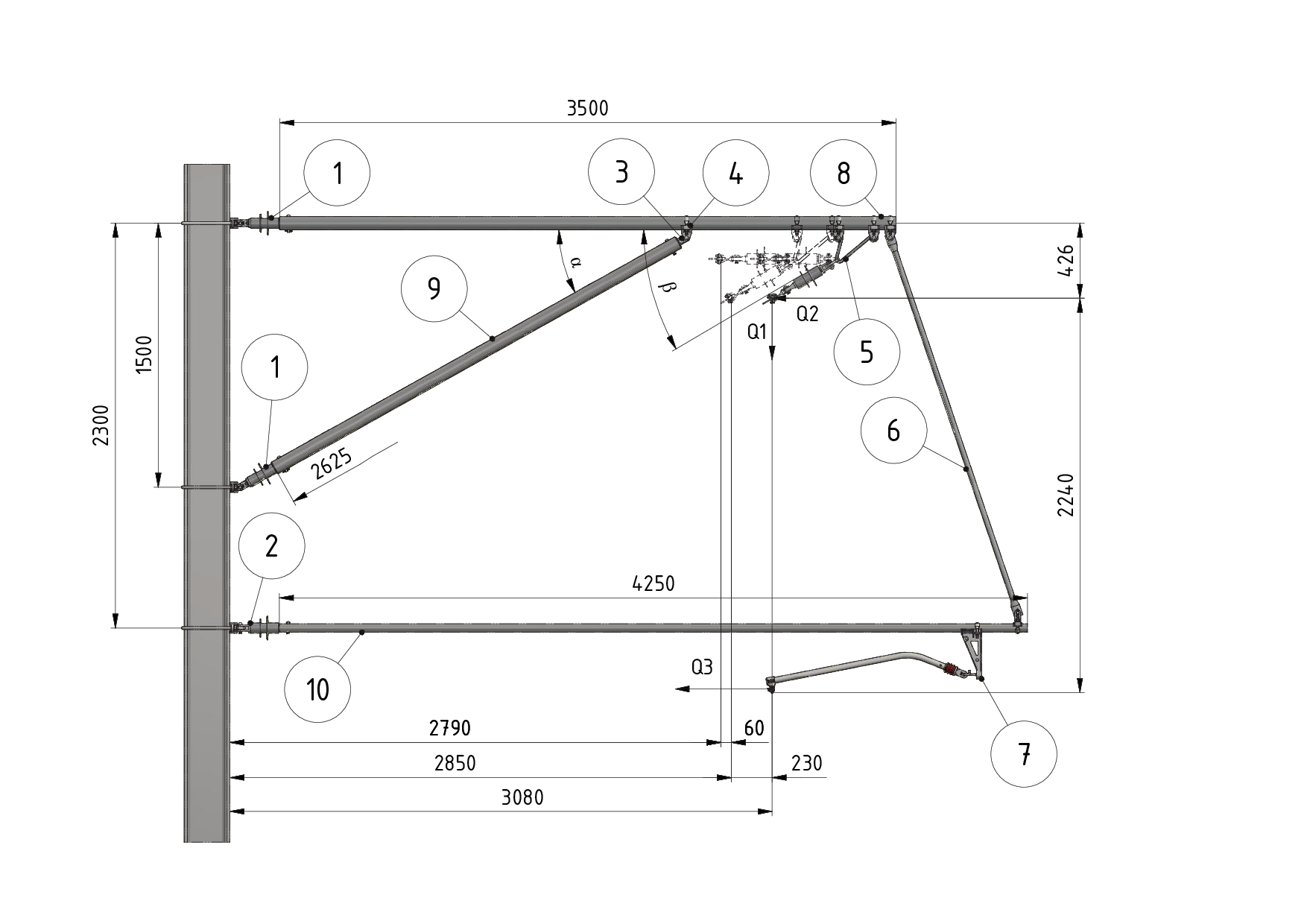 Ausleger mit Strebenrohr als Spurhaltertragrohraufhängung (Ausführungen -10 bis -18) Grundsätzlich wird für angelenkte Tragwerke aufgrund des Spurhalterzugkraft (Q3) eine Tragrohraufhängung mit Strebenrohr empfohlen.