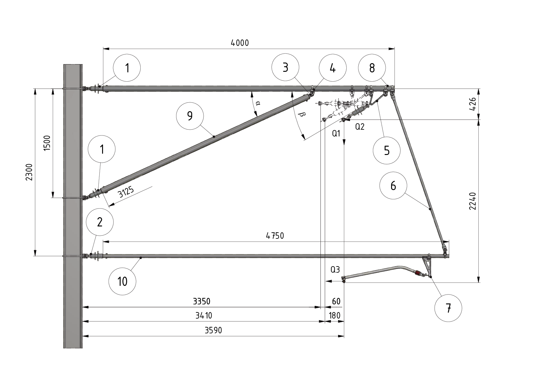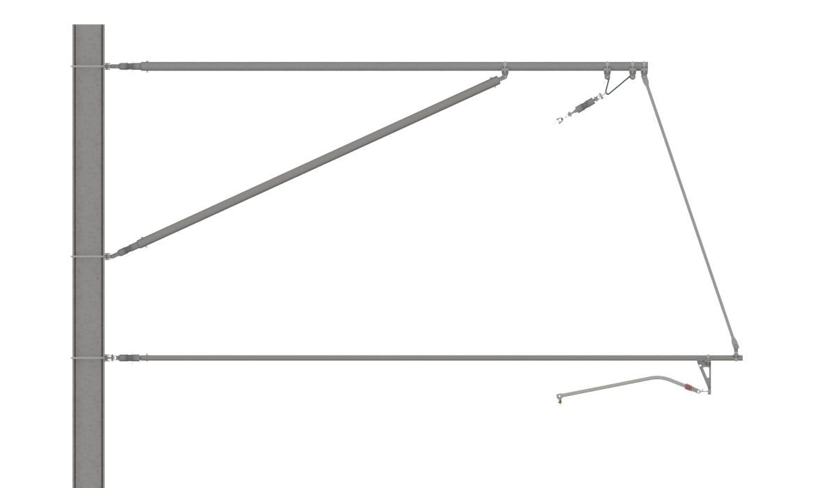 Ausleger mit Strebenrohr als Spurhaltertragrohraufhängung (Ausführungen -10 bis -18) Grundsätzlich wird für angelenkte Tragwerke aufgrund des Spurhalterzugkraft (Q3) eine Tragrohraufhängung mit Strebenrohr empfohlen.