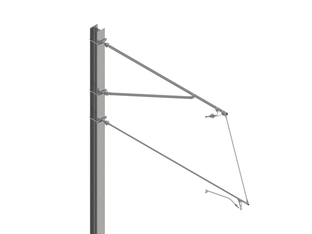 Das Auslegersystem berücksichtigt für alle Ausleger-, Streben- und Spurhalterrohre gleichbleibende Montagehöhen (b) am Masten. Die effektive Systemhöhe (sh) ist abhängig vom Neigungswinkel (β) des Tragseilisolatores. Mit den beschriebenen Befestigungshöhen am Masten wird eine Systemhöhe der FL-Kette von mindestens SH=2140mm bei Vertikalstellung des Tragseilisolators sichergestellt. Je nach Neigung des Tragseilisolatoren liegt die effektive Systemhöhe zwischen: