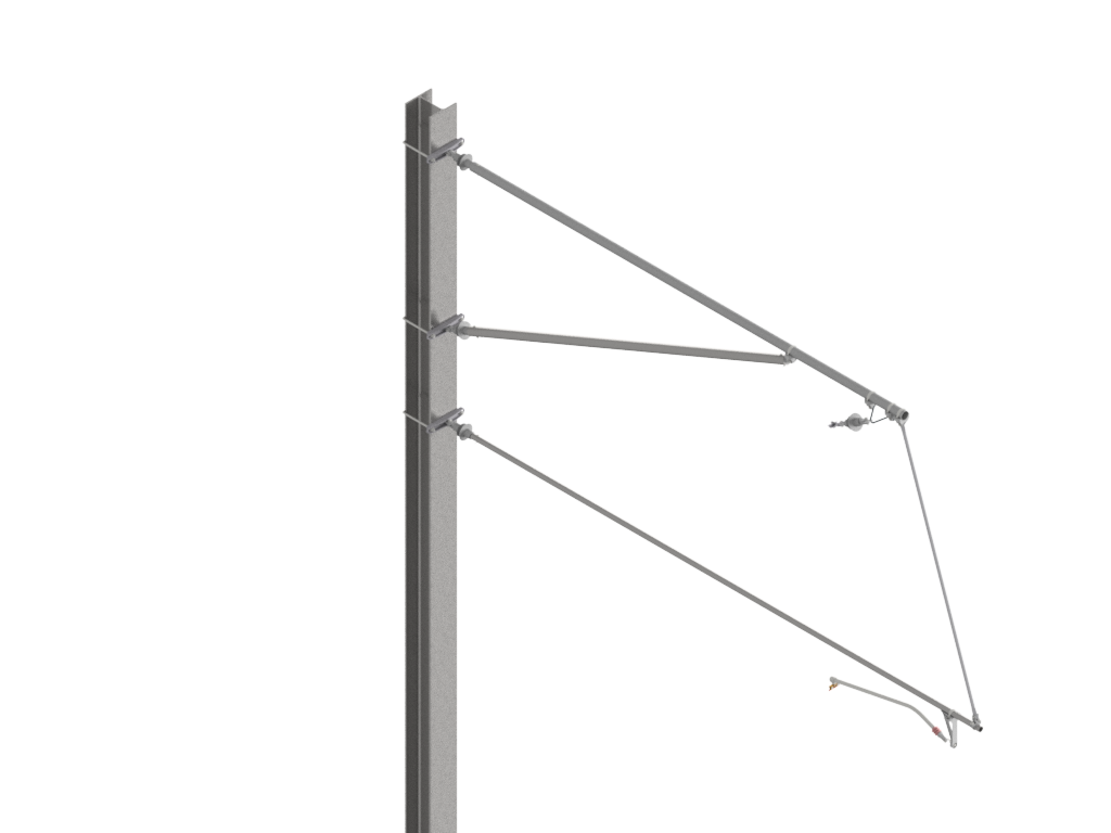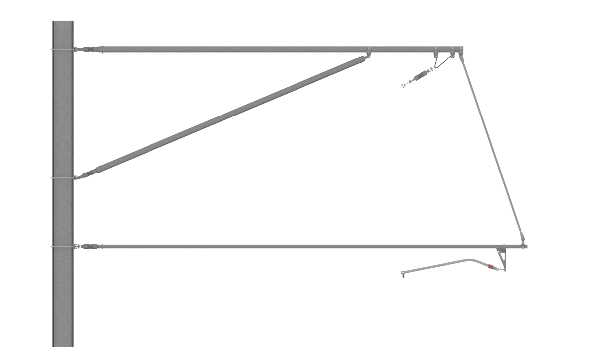 Das Auslegersystem berücksichtigt für alle Ausleger-, Streben- und Spurhalterrohre gleichbleibende Montagehöhen (b) am Masten. Die effektive Systemhöhe (sh) ist abhängig vom Neigungswinkel (β) des Tragseilisolatores. Mit den beschriebenen Befestigungshöhen am Masten wird eine Systemhöhe der FL-Kette von mindestens SH=2140mm bei Vertikalstellung des Tragseilisolators sichergestellt. Je nach Neigung des Tragseilisolatoren liegt die effektive Systemhöhe zwischen:
