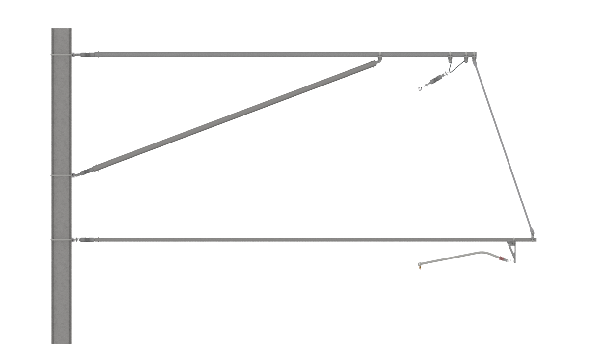 Das Auslegersystem berücksichtigt für alle Ausleger-, Streben- und Spurhalterrohre gleichbleibende Montagehöhen (b) am Masten. Die effektive Systemhöhe (sh) ist abhängig vom Neigungswinkel (β) des Tragseilisolatores. Mit den beschriebenen Befestigungshöhen am Masten wird eine Systemhöhe der FL-Kette von mindestens SH=2140mm bei Vertikalstellung des Tragseilisolators sichergestellt. Je nach Neigung des Tragseilisolatoren liegt die effektive Systemhöhe zwischen: