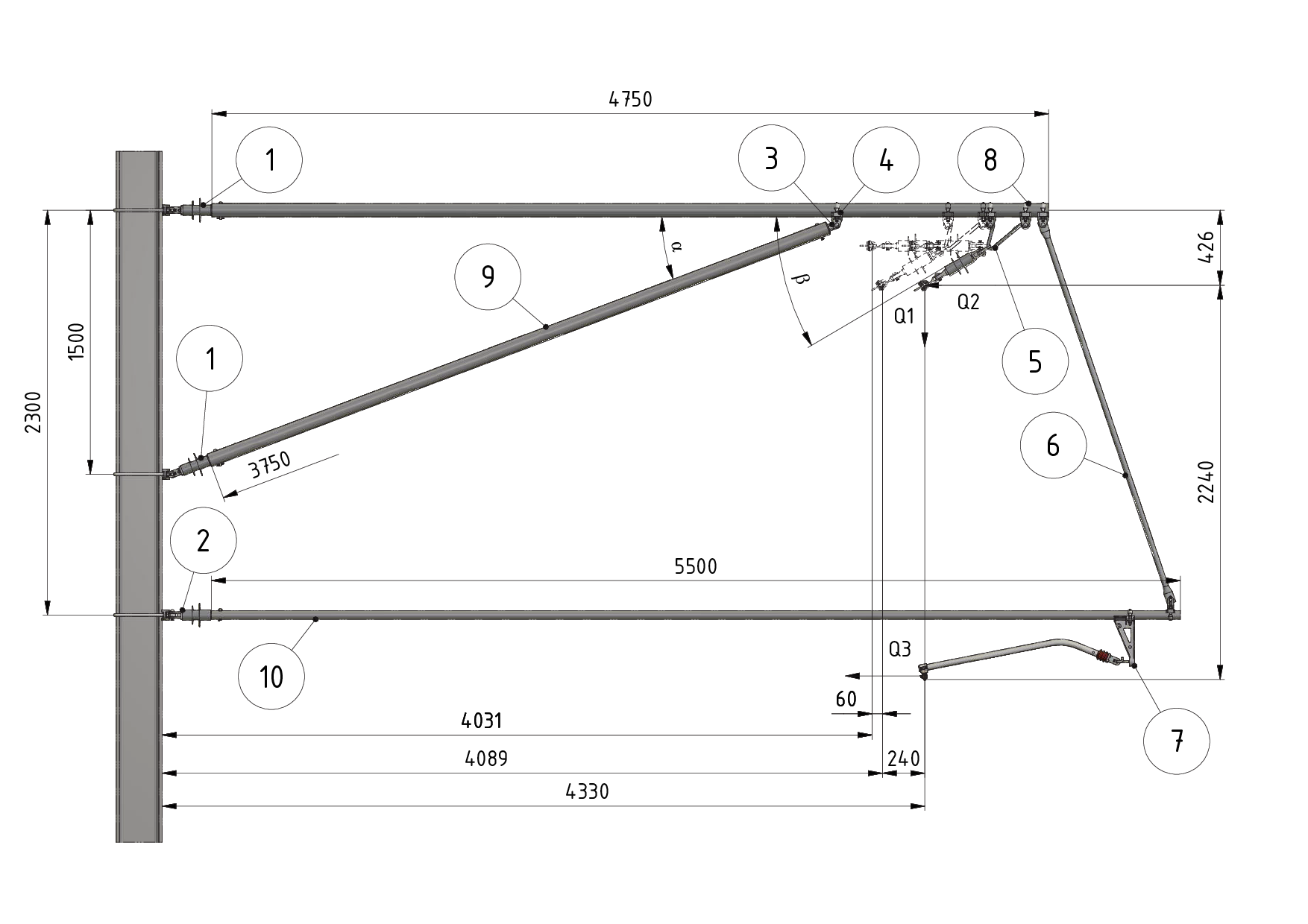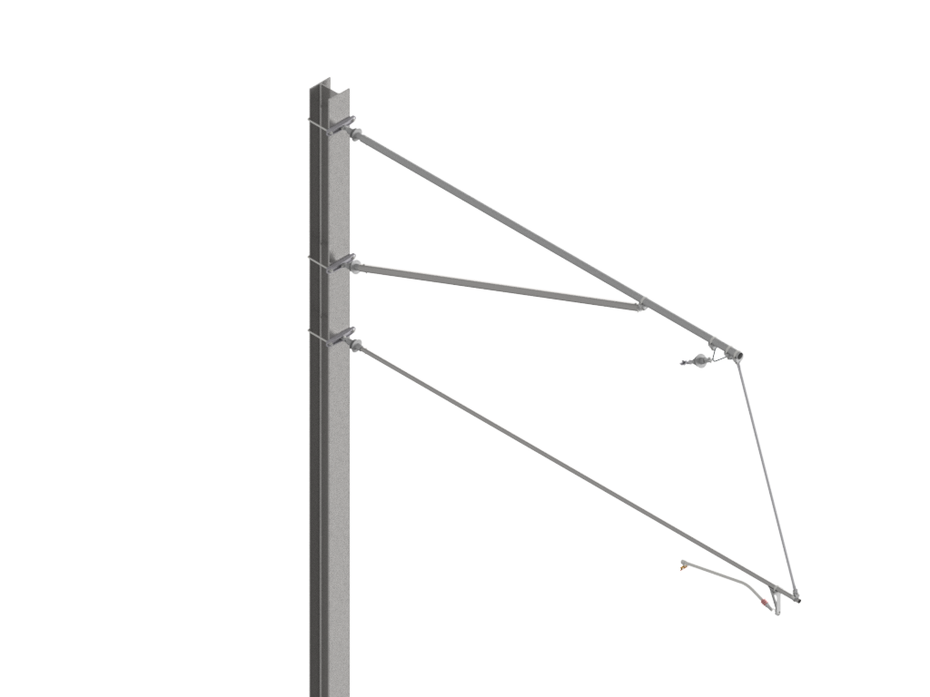 Ausleger mit Strebenrohr als Spurhaltertragrohraufhängung (Ausführungen -10 bis -18) Grundsätzlich wird für angelenkte Tragwerke aufgrund des Spurhalterzugkraft (Q3) eine Tragrohraufhängung mit Strebenrohr empfohlen.