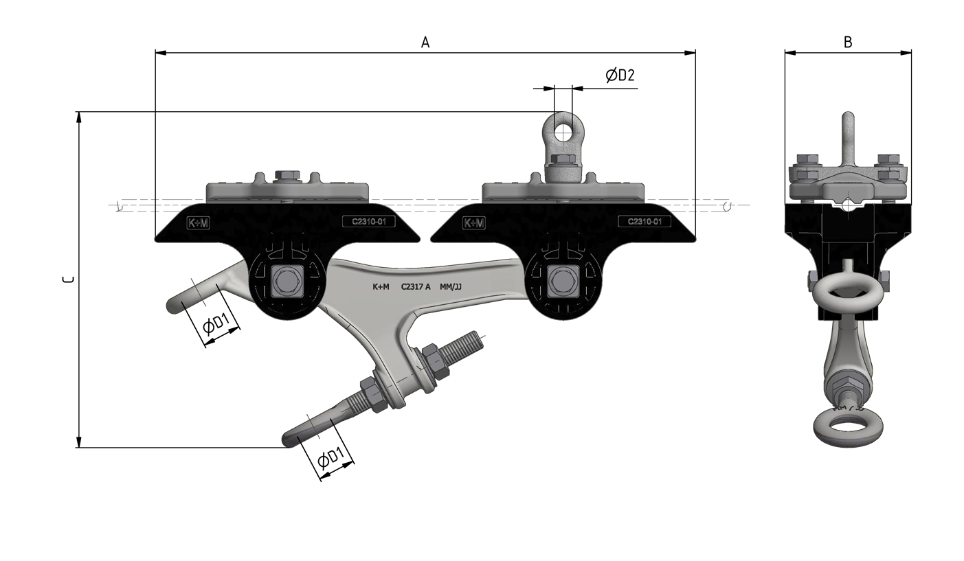 Corps isolant pour fixation au câble métallique, en courbe moyenne jusqu’en courbe serrée. Réglage progressif de l’œillet de suspension double, prévu pour tut le type pince de courbeSpécification