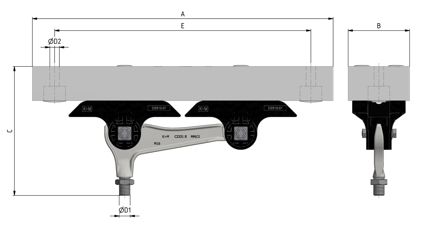 Corps isolé sur rail d'ancrage sans vis de suspension KUSYS type 2 avec boulon fileté M16 rigide